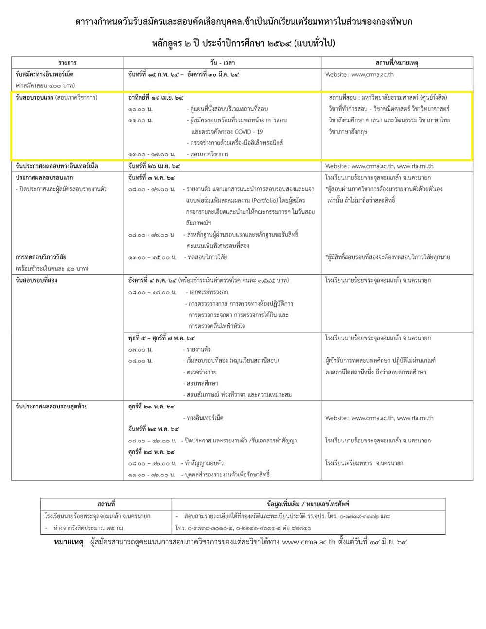 ตารางกำหนดวันรับสมัครและสอบคัดเลือกบุคคลเข้าเป็นนักเรียนเตรียมทหารในส่วนของกองทัพบก หลักสูตร 2 ปี ประจำปีการศึกษา 2564 (แบบทั่วไป)