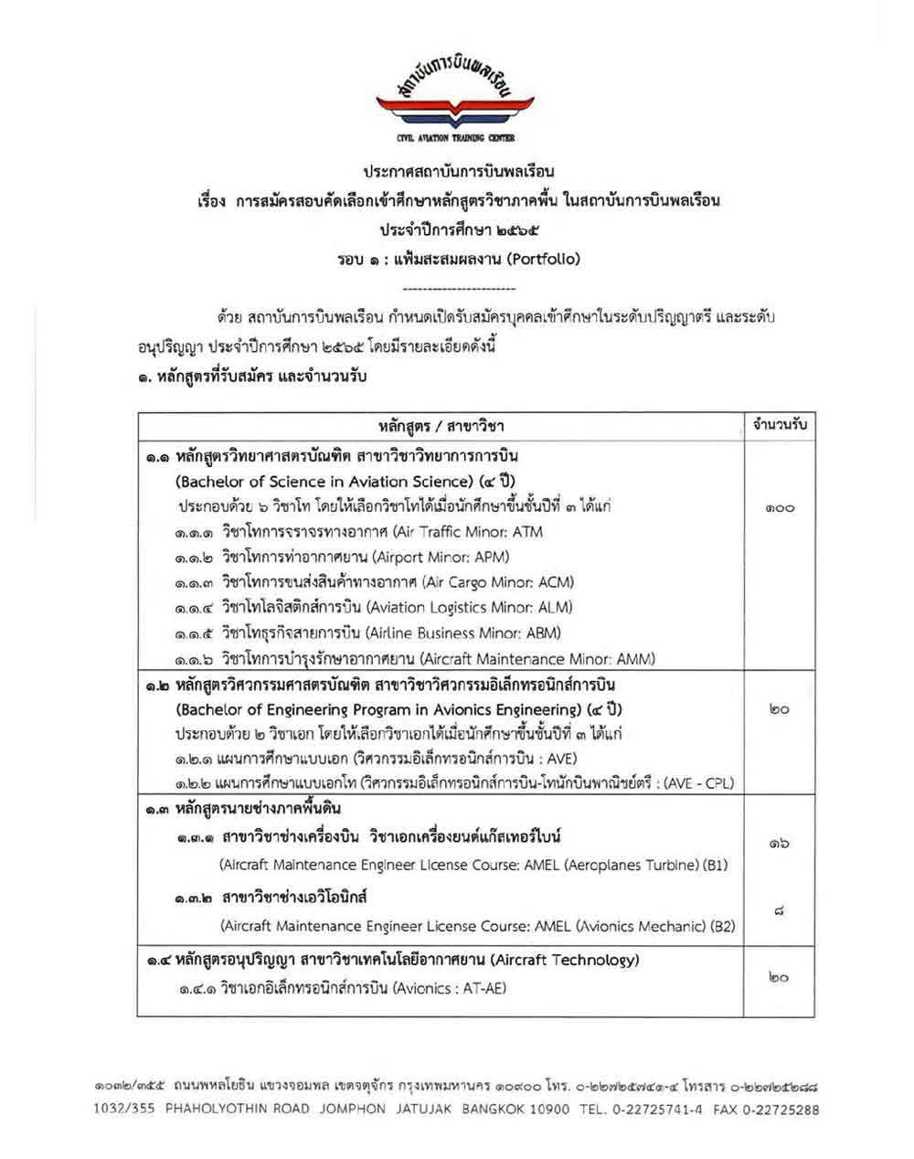 ประกาศสถาบันการบินพลเรือนเรื่อง การสมัครสอบคัดเลือกเข้าศึกษาหลักสูตรวิชาภาคพื้น รอบ 2 : แฟ้มสะสมผลงาน (Portfolio) 2565
