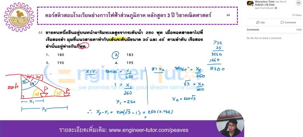 คอร์สติวสอบโรงเรียนช่างการไฟฟ้าส่วนภูมิภาค หลักสูตร 3 ปี ตะลุยโจทย์ วิชาคณิตศาสตร์ วันที่ 19 เม.ย. 2564