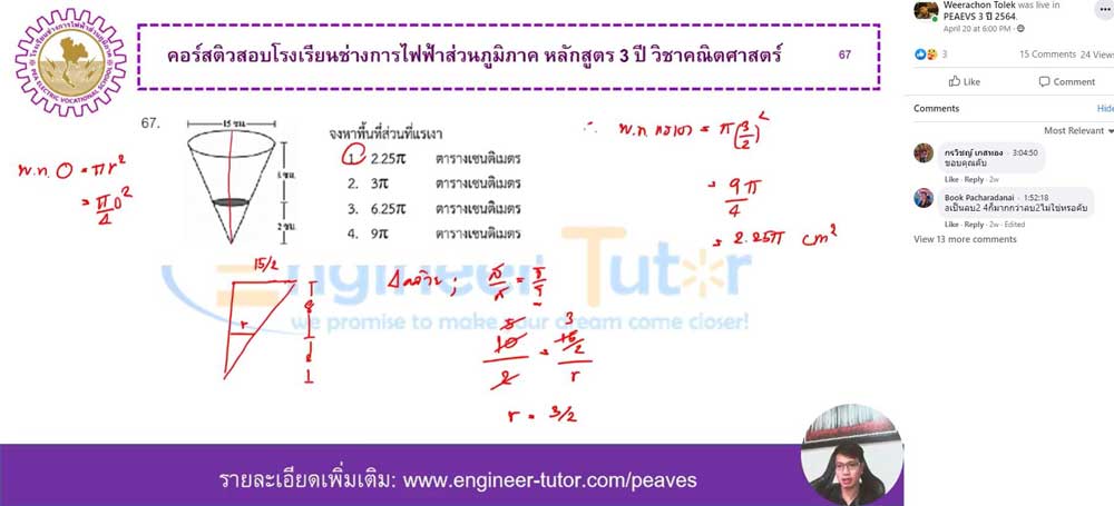 คอร์สติวสอบโรงเรียนช่างการไฟฟ้าส่วนภูมิภาค หลักสูตร 3 ปี ตะลุยโจทย์ วิชาคณิตศาสตร์ วันที่ 20 เม.ย. 2564
